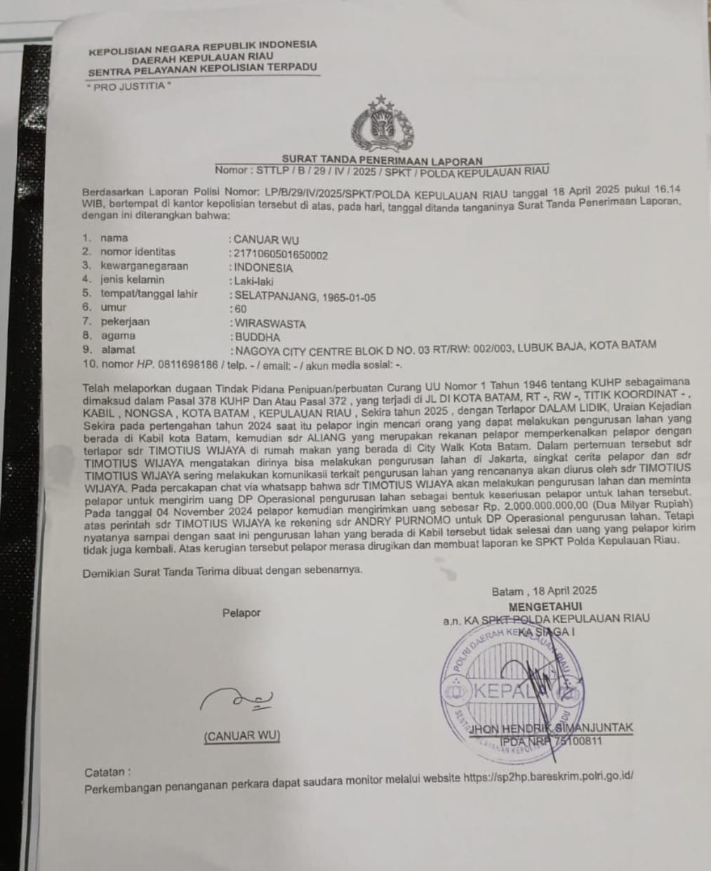 Laporan tersebut berkaitan dengan pengurusan lahan di kawasan Kabil, Kota Batam, yang diduga tidak pernah direalisasikan oleh terlapor “Timotius Wijaya”