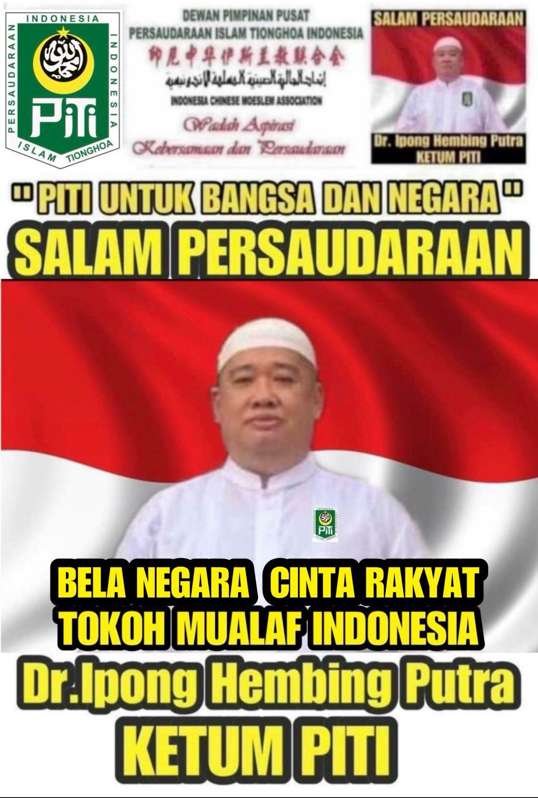 Dengan penuh rasa syukur dan kebahagiaan, saya Dr. Ipong Hembing Putra, Ketua Umum Persaudaraan Islam Tionghoa Indonesia (PITI), mengucapkan Selamat Hari Raya Idul Fitri 1 Syawal 1447 H kepada seluruh jajaran pengurus pusat maupun daerah, serta masyarakat seluruh Indonesia.